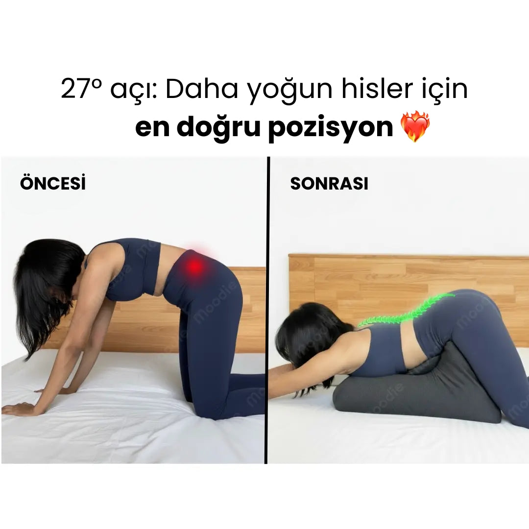 27° açı ile pelvisi optimize ederek iç temas ve basınç dağılımını artırır. Yastığın konumlandırması, her iki partnerin de daha az efor sarf etmesini sağlarken, kilit noktalarda uyarımı artırır. Bu da deneyimi daha tatmin edici ve fiziksel olarak daha az yorucu hale getirir.
